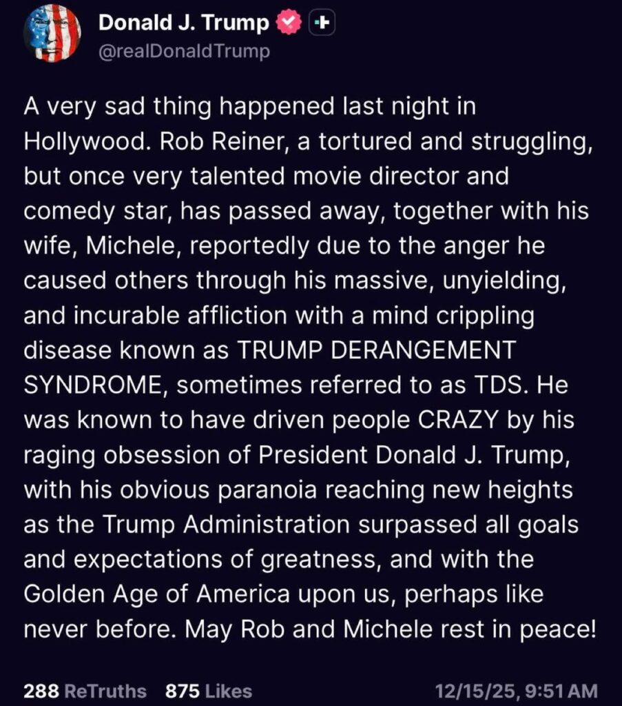 Below is the frankly foul, sick, and self-centered post by Mad King Donald Trump, reacting to the horrific stabbing murder of Mr. Reiner and his wife, Michele, apparently by their son.