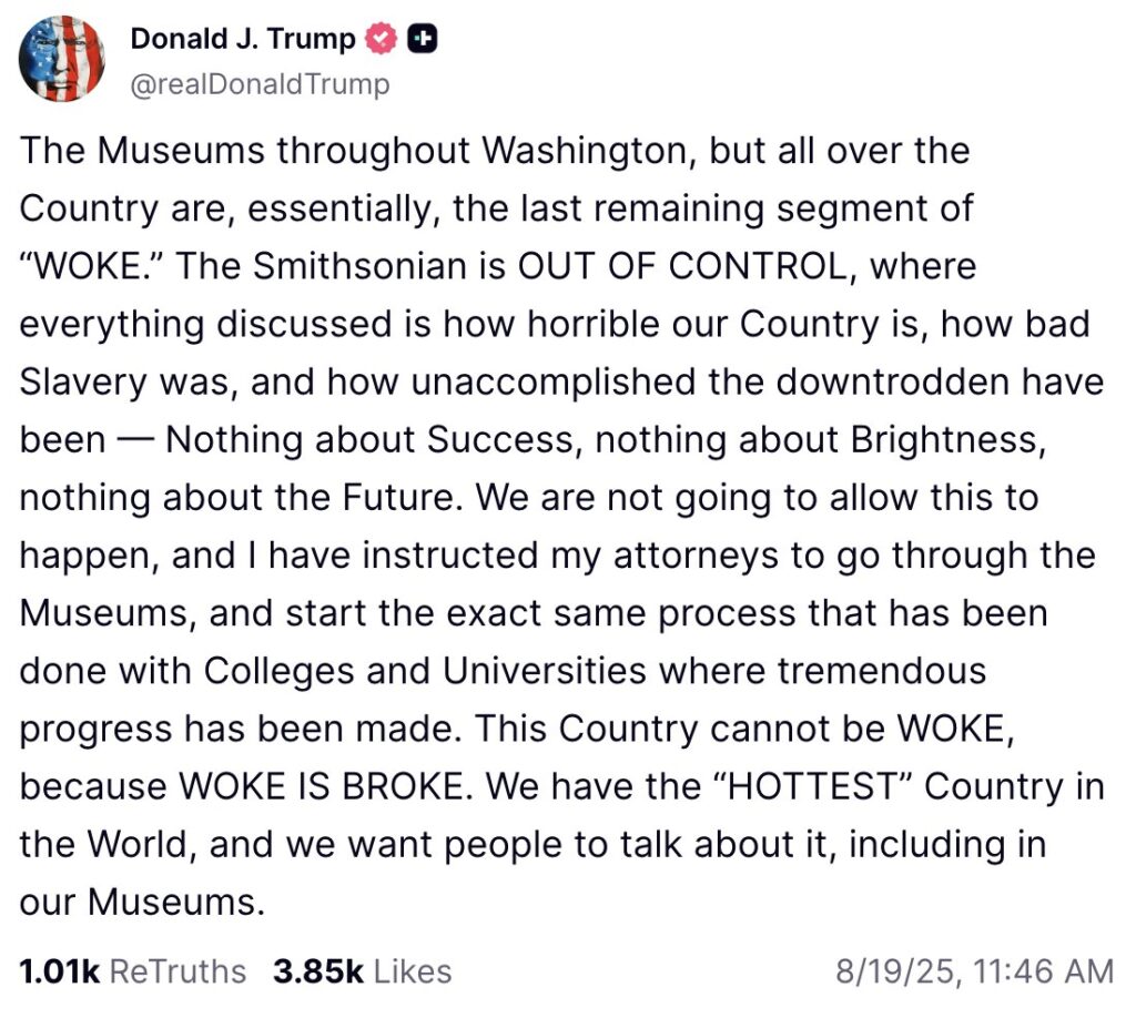 Last month, Administration pressure apparently caused the Smithsonian Museum to remove an exhibit narrative that reminded viewers that Donald Trump was impeached twice in his first term.